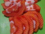 - Kupas kulit pepaya lalu belah 2 melintang. Bersihkan dari bijinya. Cuci bersih. Tiriskan. Kerok bagian dalam dengan kerokan bulat. Sisihkan bulatan2 buah pepaya untuk dimasukkan lagi nantinya.